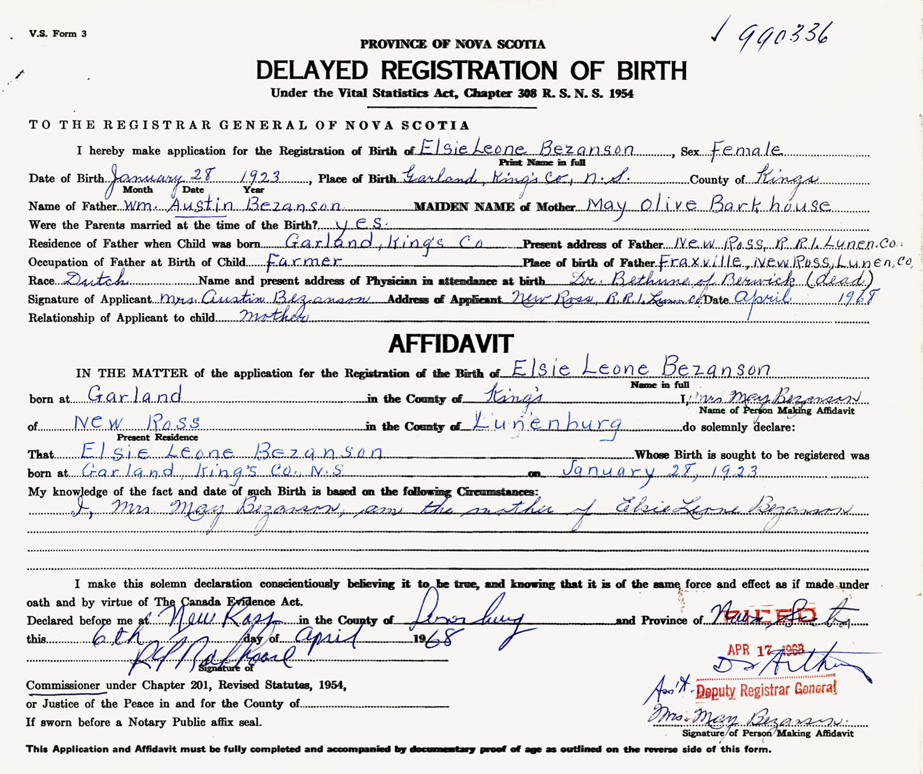 I hereby make application for the Registration of Birth of Elsie LeoneBezanson Sex Female
