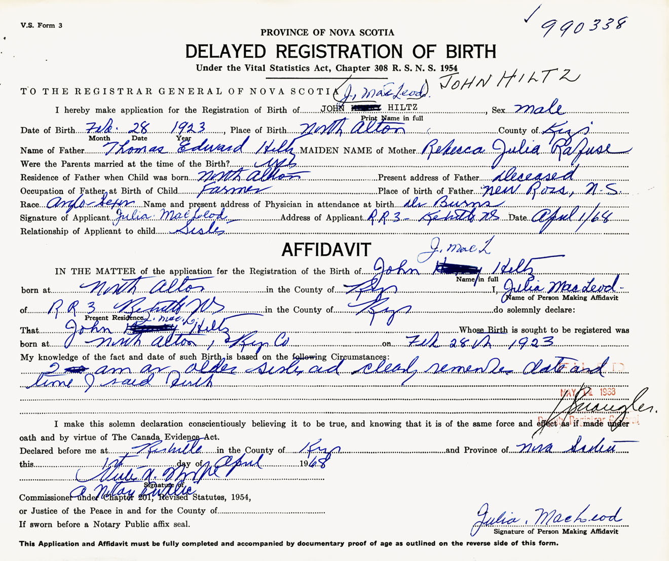 Name of Father Thomas Edward Hiltz MAIDEN NAME of Mother Rebecca Julia Rafuse
