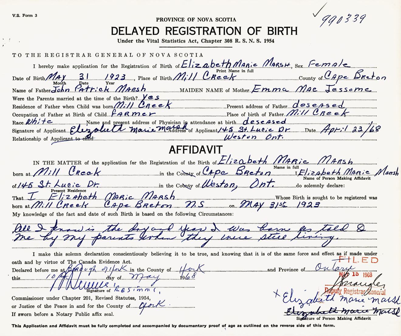 Date of Birth May 31, 1923 Place of Birth Mill CreekCounty of Cape Breton