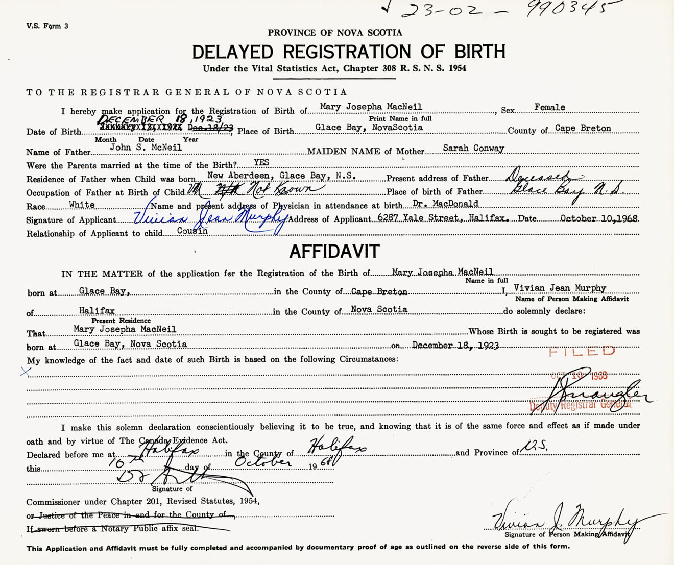 Signature of Applicant Vivian Jean Murphy Address of Applicant 6287 Yale Street, Halifax, NS Date 10 October 1968