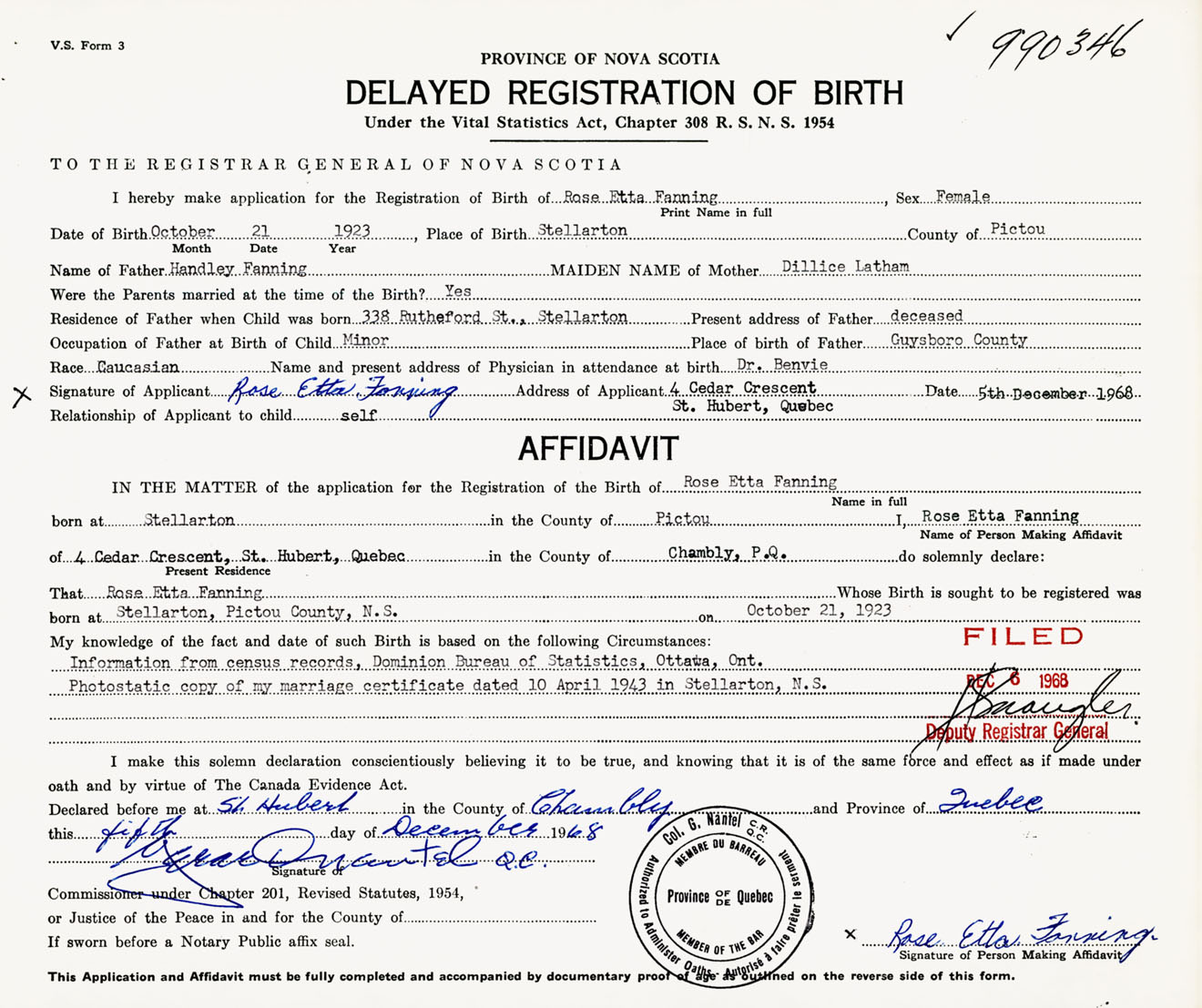 Signature of Applicant Rose Etta Fanning Address of Applicant 4 Cedar Crescent, St. Hubert, Quebec Date 5 December 1968