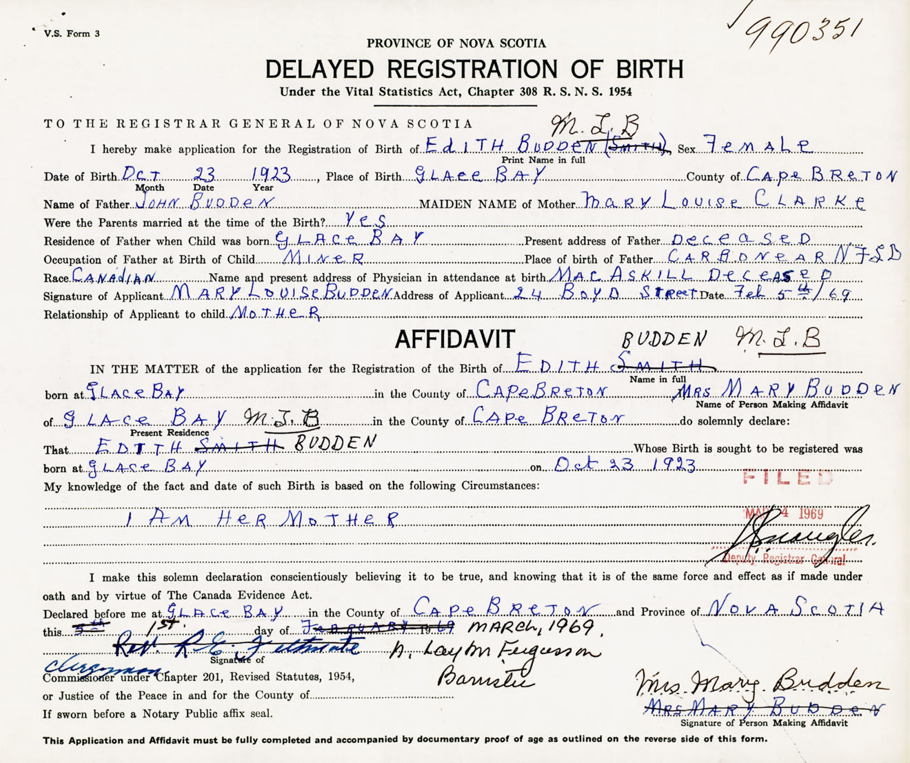 Signature of Applicant Mary Louise Budden Address of Applicant 24 Boyd Street, Glace Bay, Cape Breton Co., NS Date 5 February 1969