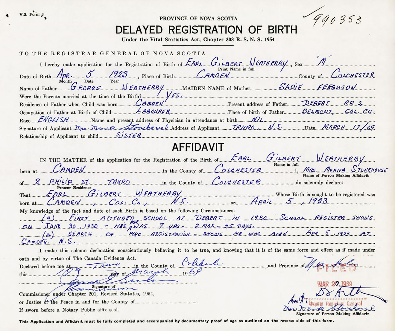 Signature of Applicant Mrs. Merna Stonehouse Address of Applicant Truro, Colchester Co., NS Date 17 March 1969