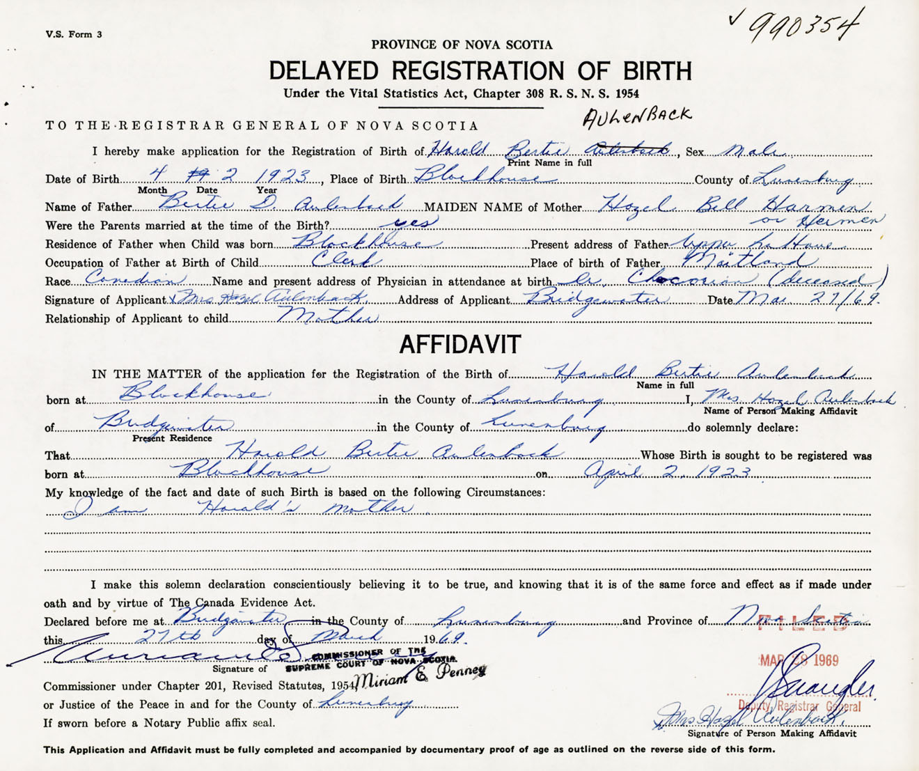 Signature of Applicant Mrs. Hazel Aulenback Address of Applicant Bridgewater, Lunenburg Co., NS Date 27 March 1969