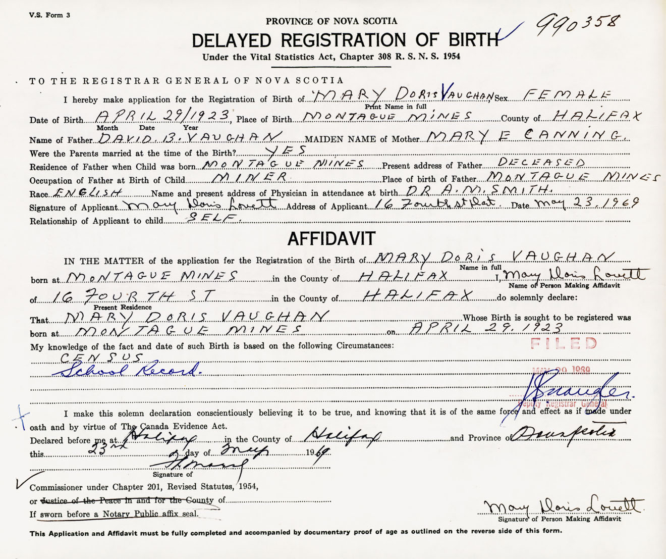 Signature of Applicant Mary Doris Lovett Address of Applicant 16 Fourth Street, Dartmouth, NS Date 23 May 1969