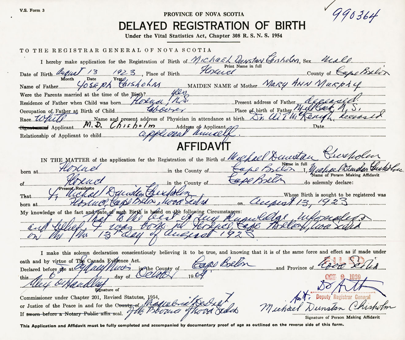 I hereby make application for the Registration of Birth of Michael DunstonChisholm Sex Male