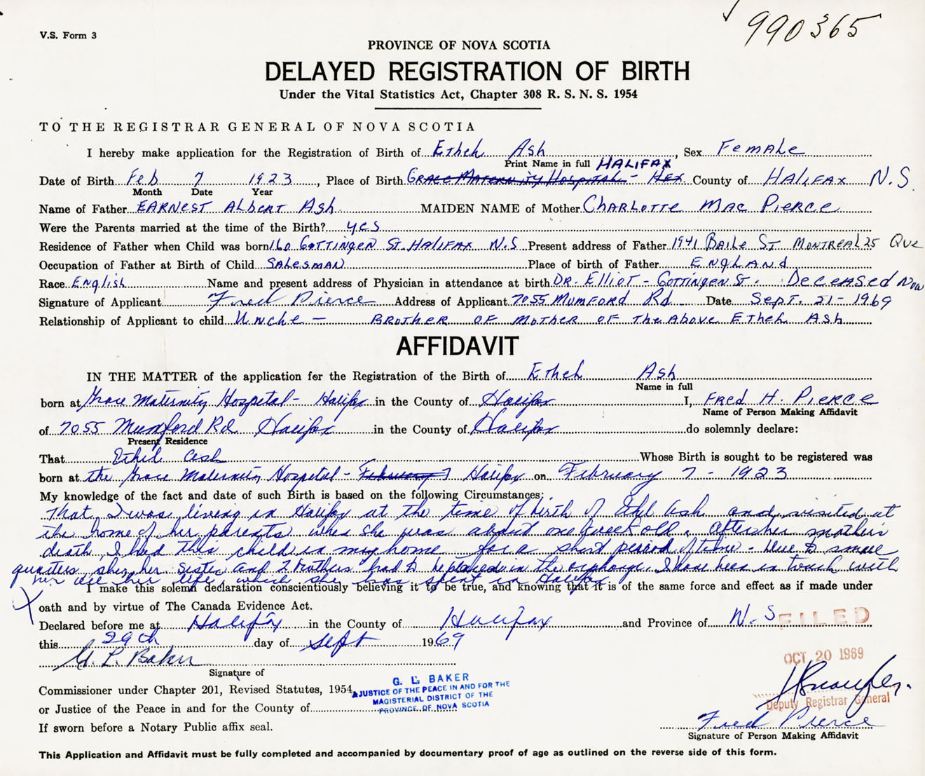That I was living in Halifax at the time of birth of Ethel Ash and visited at the home of her parents when she was about one week old. After her mother's death, I had the children in my home for a short period of time due to small quarters. She, her sister and 2 brothers had to be placed in the orphanage. I have been in touch with her all her life which she has spent in Halifax.