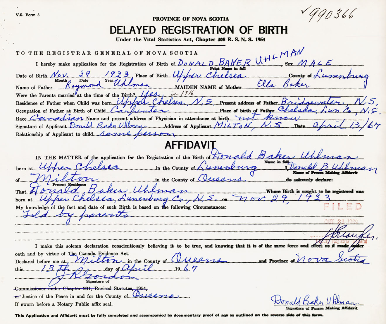 Signature of Applicant Donald Baker Uhlman Address of Applicant Milton, Queens Co., NS Date 13 April 1967