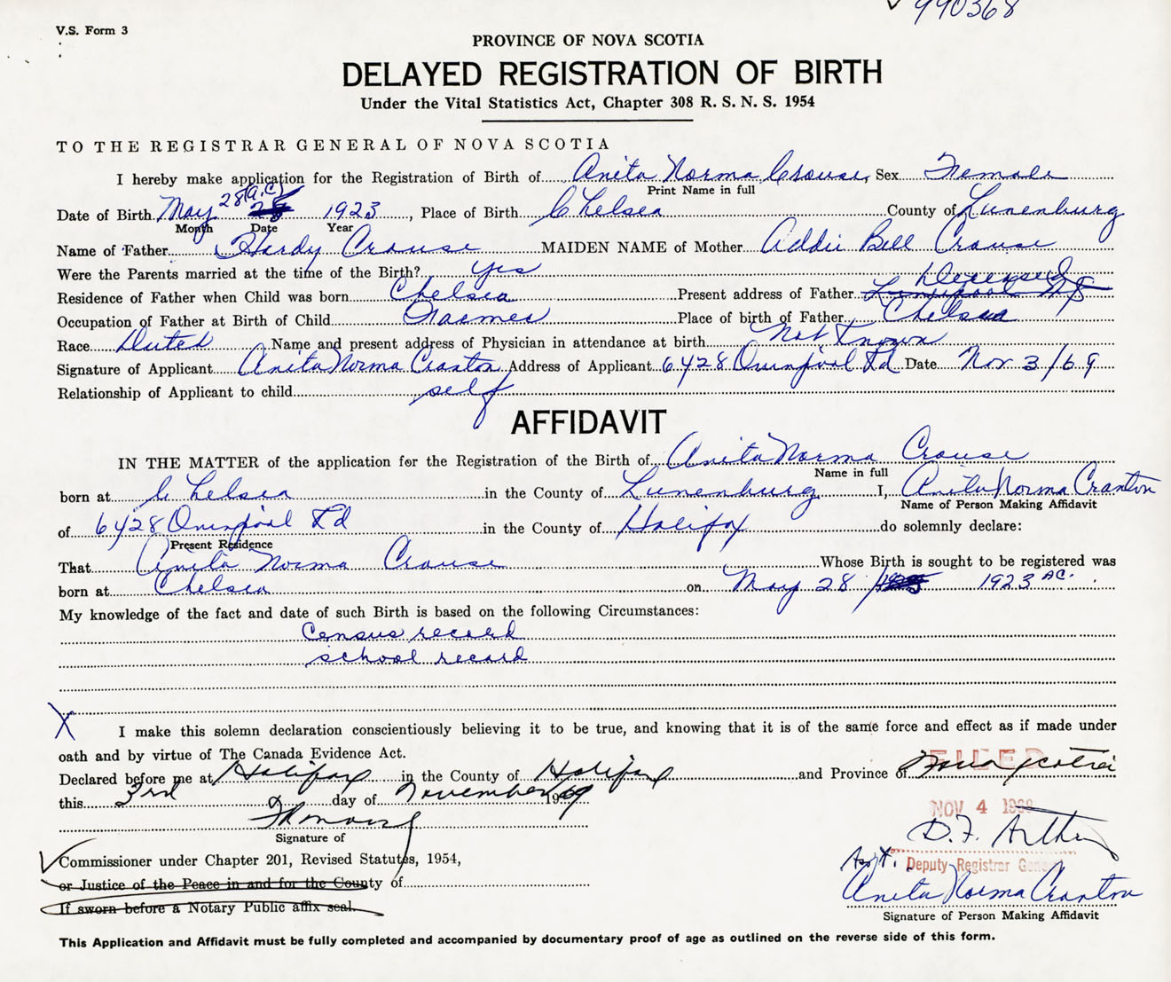 Signature of Applicant Anita Norma Cranton Address of Applicant 6428 Quinpool Road, Halifax, NS Date 3 November 1969
