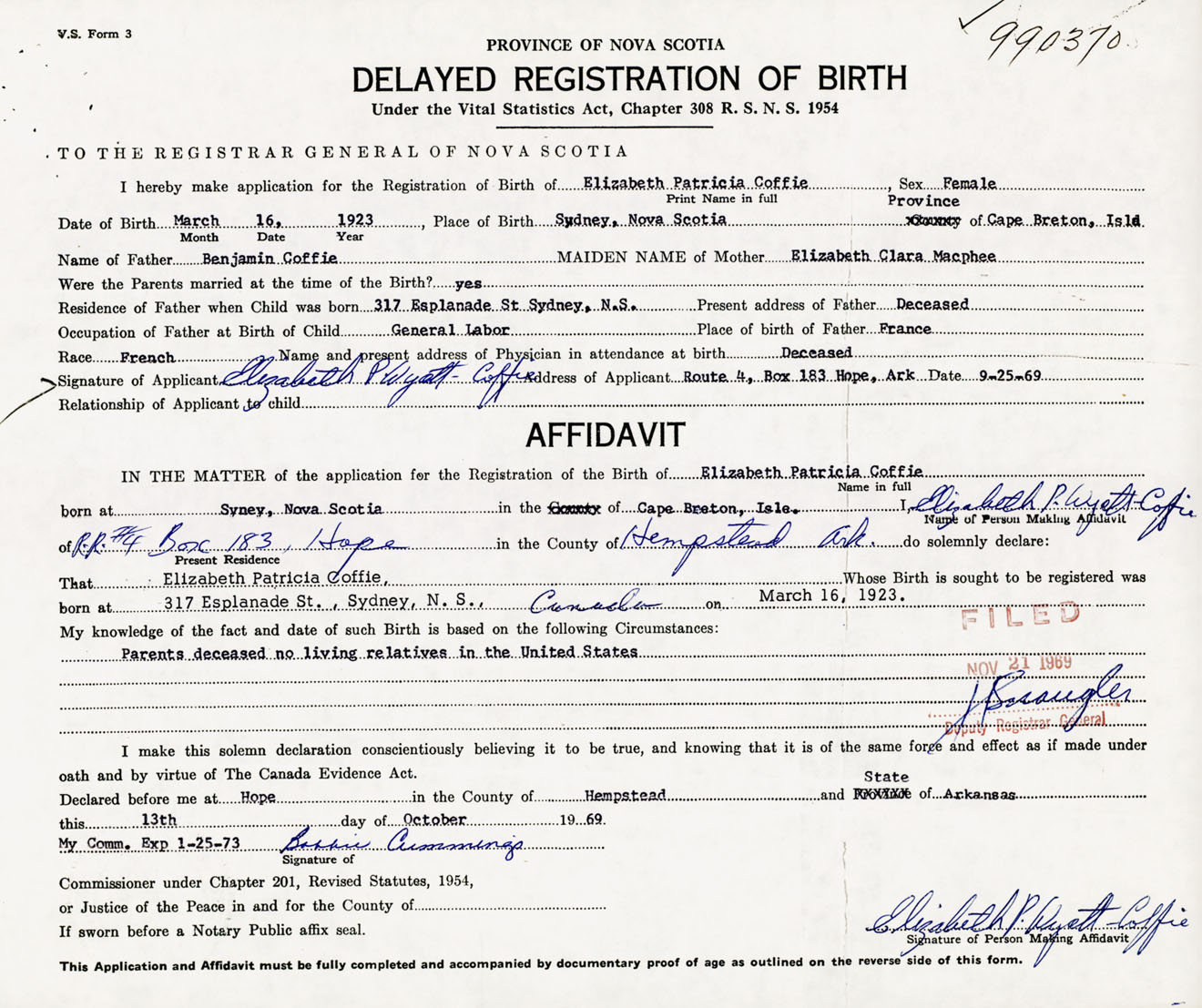Signature of Applicant Elizabeth Patricia Coffie Address of Applicant Box 183, Route 4, Hope, Arkansas, USA Date 25 September 1969