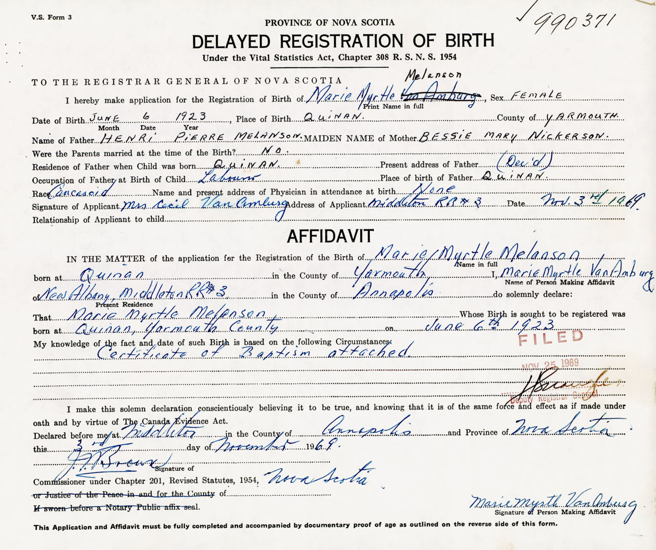 21. Name and Post Office address of Informant Mrs. Cecil Vanamburg RR #3, Middleton, Annapolis Co., NS