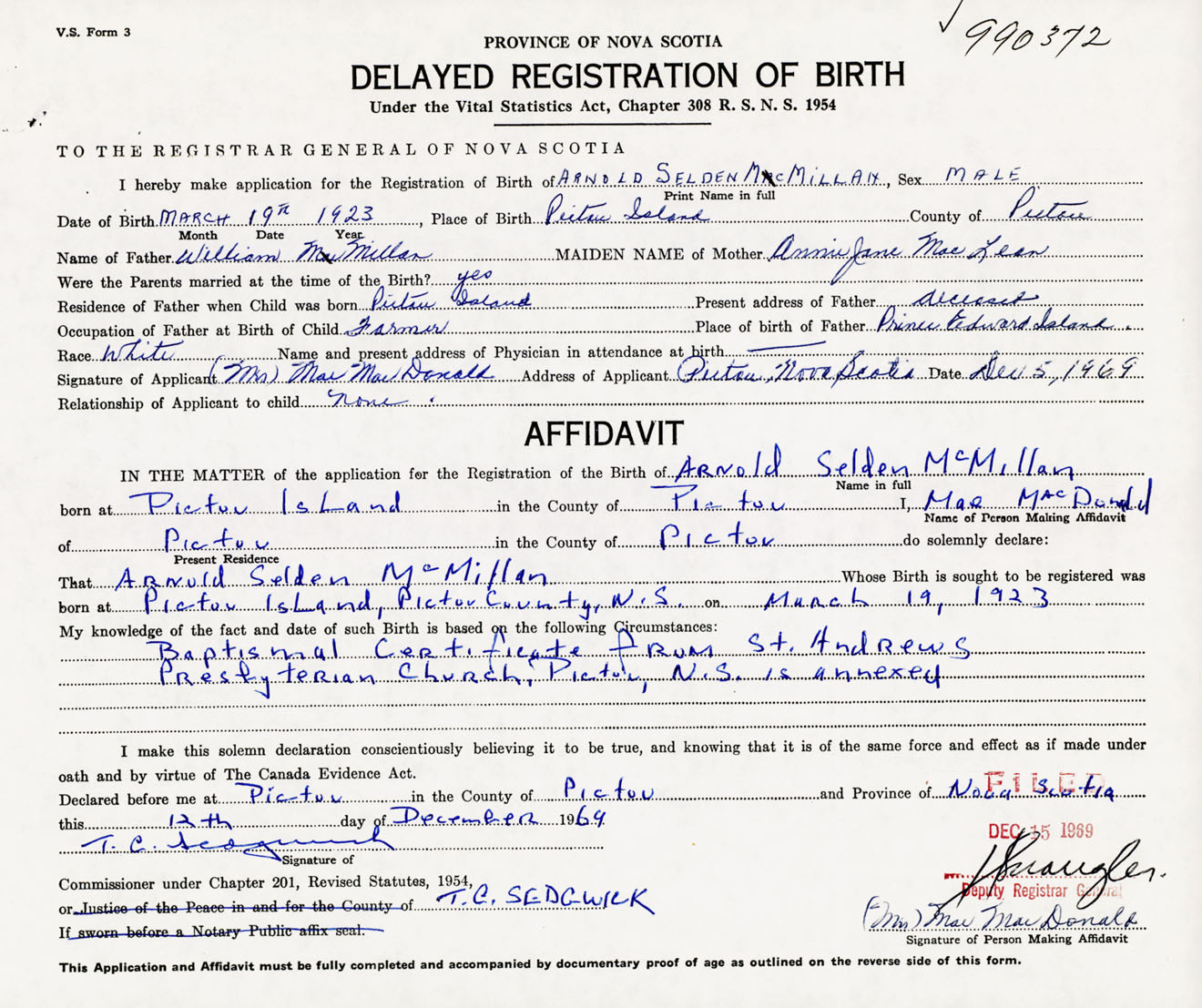 I hereby make application for the Registration of Birth of Arnold SeldenMcMillan Sex Male