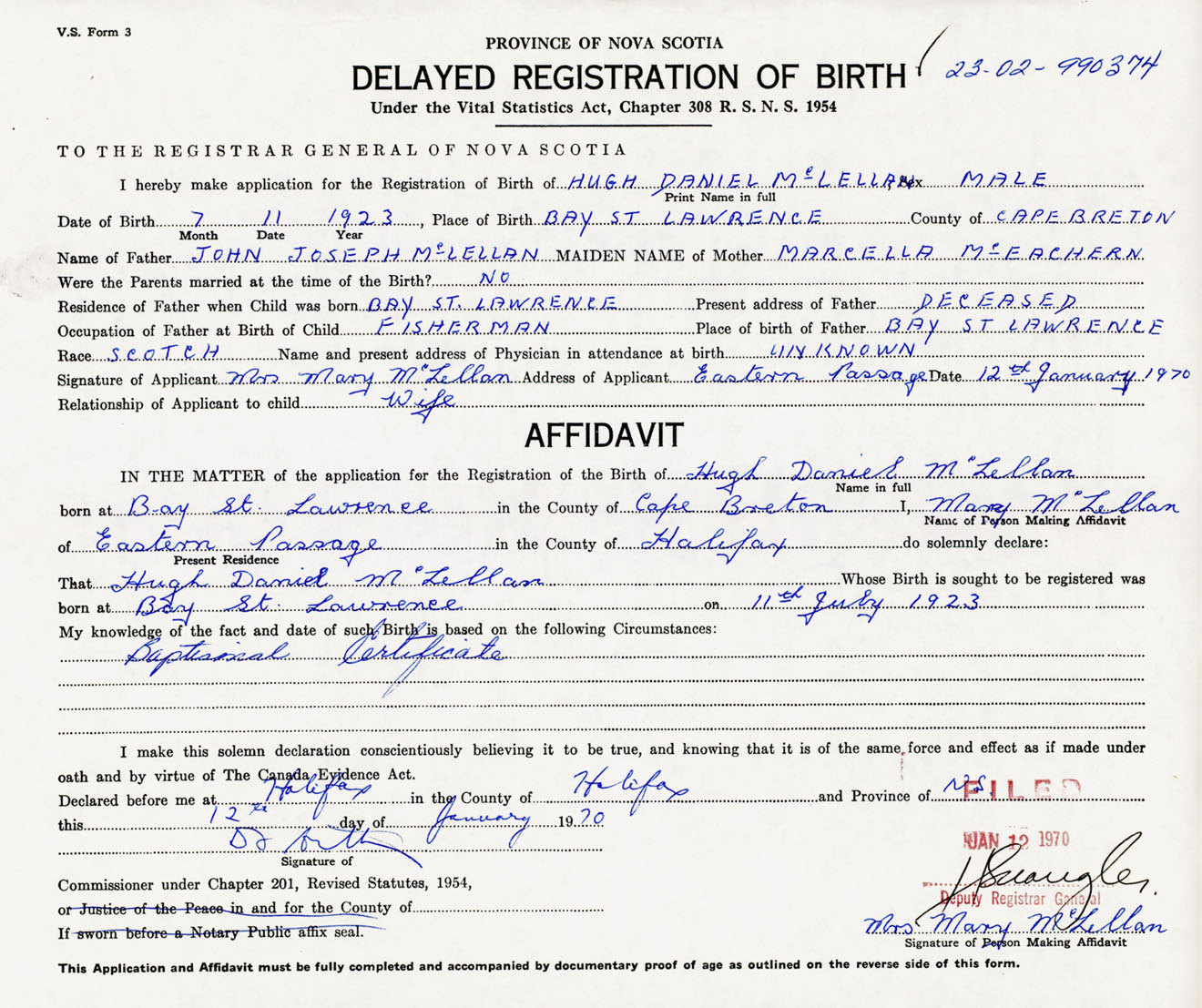 Date of Birth July 11, 1923 Place of Birth Bay St. LawrenceCounty of Cape Breton
