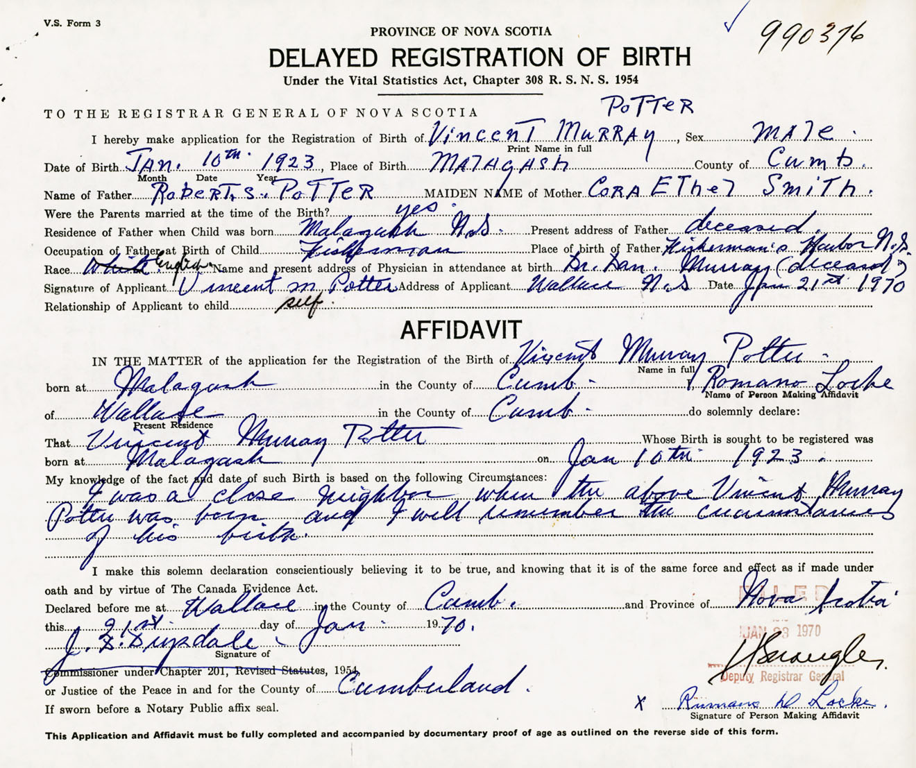 Signature of Applicant Vincent M. Potter Address of Applicant Wallace, Cumberland Co., NS Date 21 January 1970