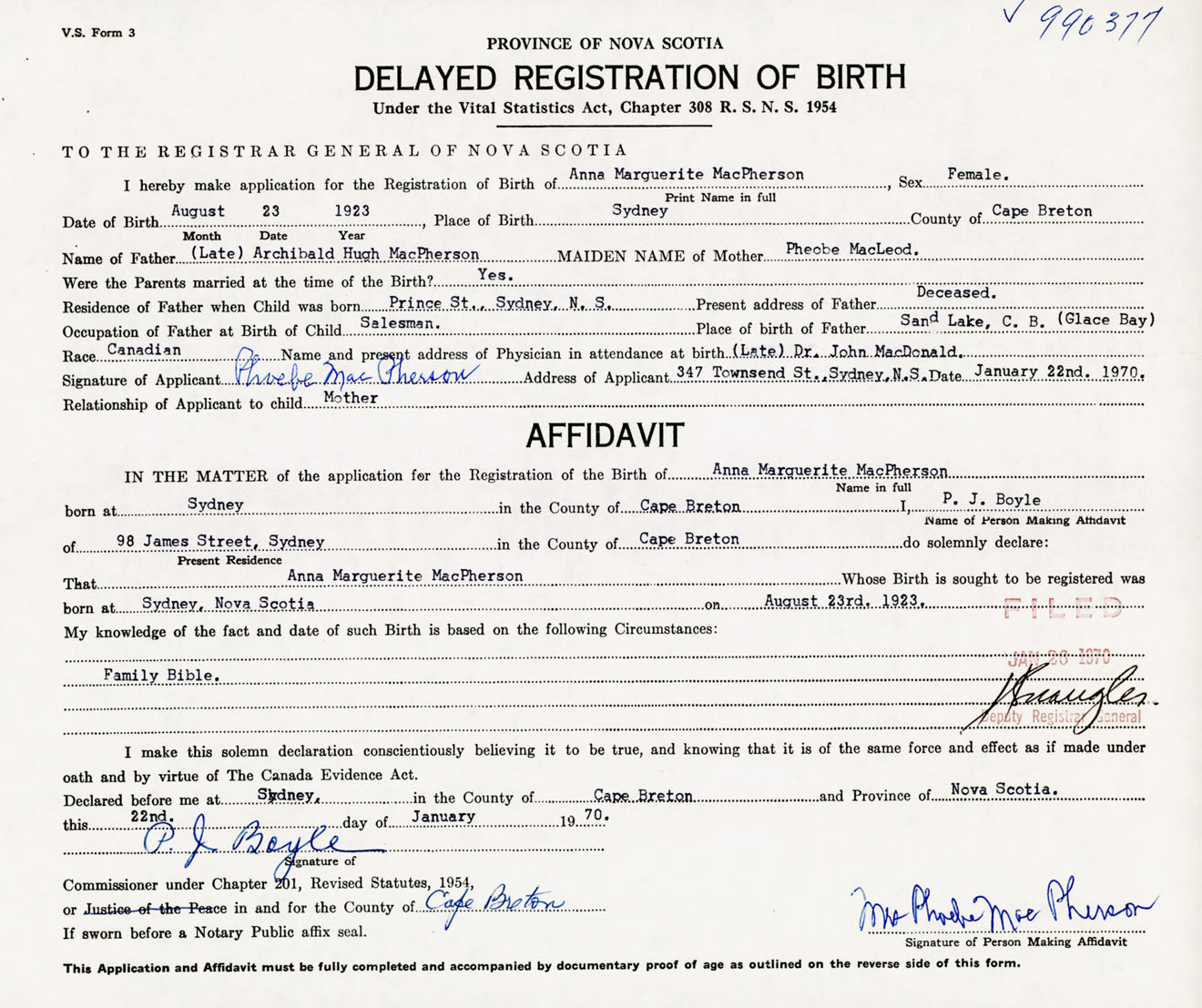 Signature of Applicant Phoebe MacPherson Address of Applicant 347 Townsend Street, Sydney, Cape Breton Co., NS Date 22 January 1970