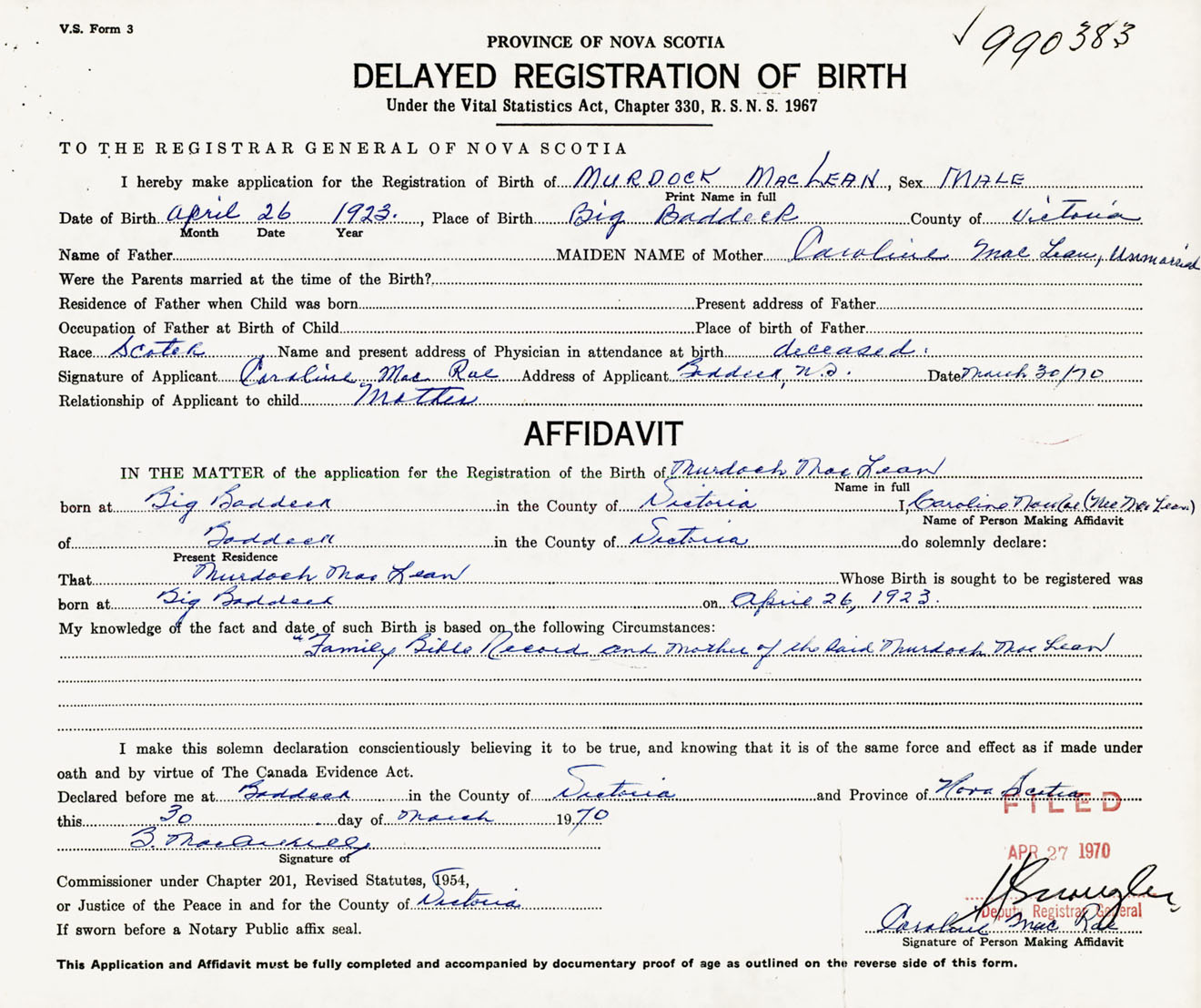 I hereby make application for the Registration of Birth of MurdockMacLean Sex Male