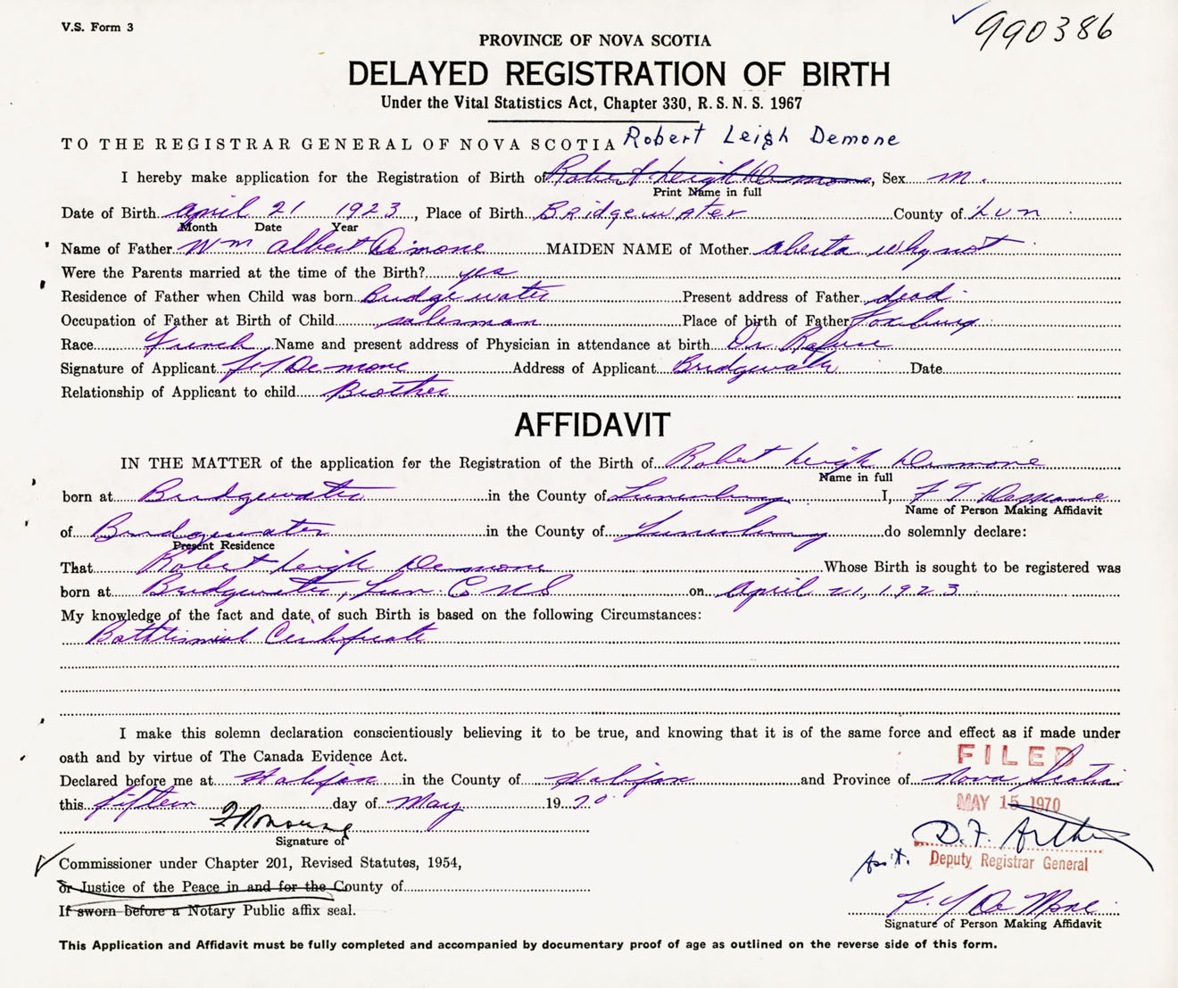 Date of Birth April 21, 1923 Place of Birth BridgewaterCounty of Lunenburg