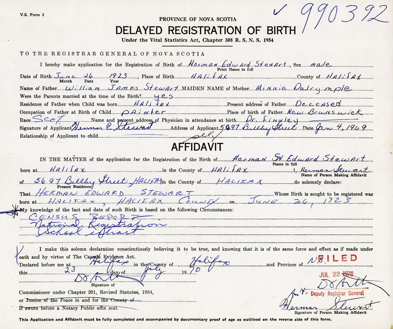 I hereby make application for the Registration of Birth of Herman EdwardStewart Sex Male