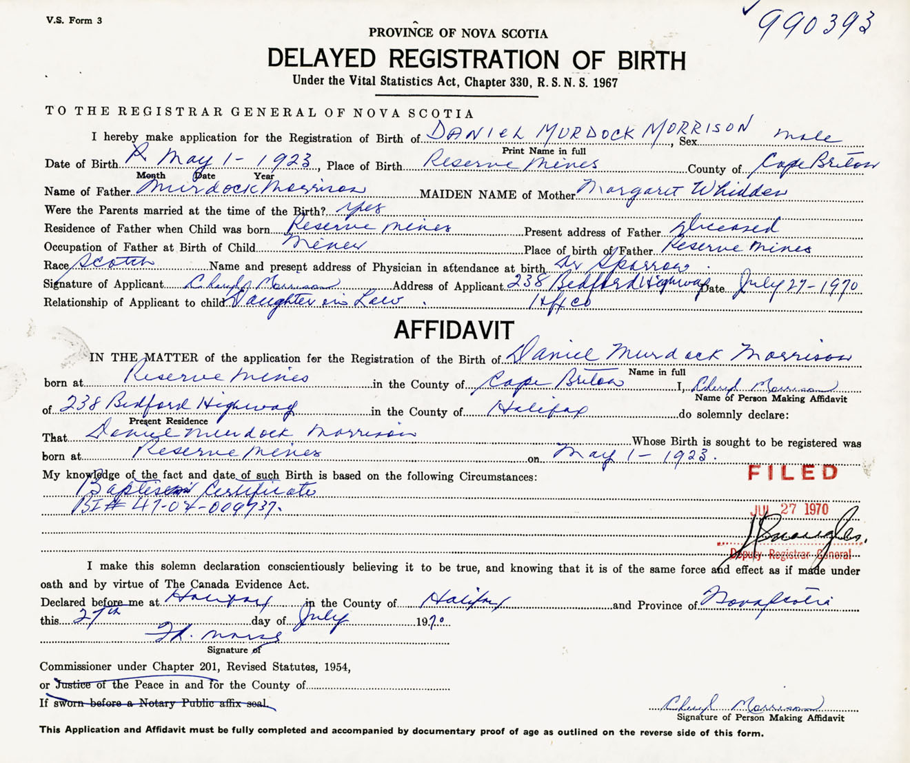Date of Birth May 1, 1923 Place of Birth Reserve MinesCounty of Cape Breton
