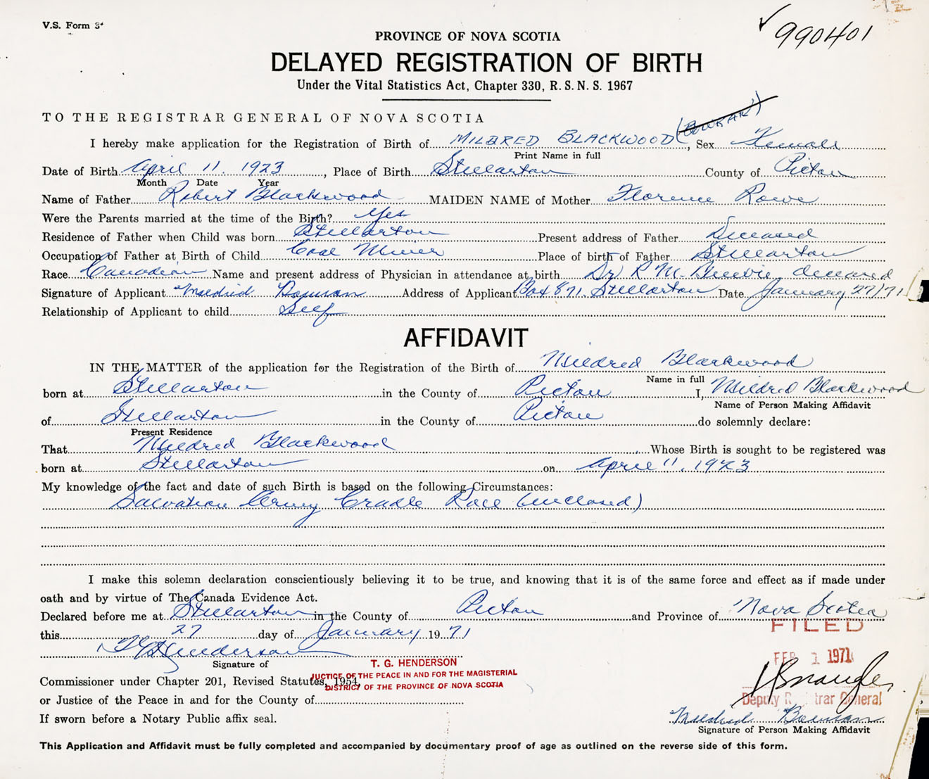 I hereby make application for the Registration of Birth of MildredBlackwood Sex Female