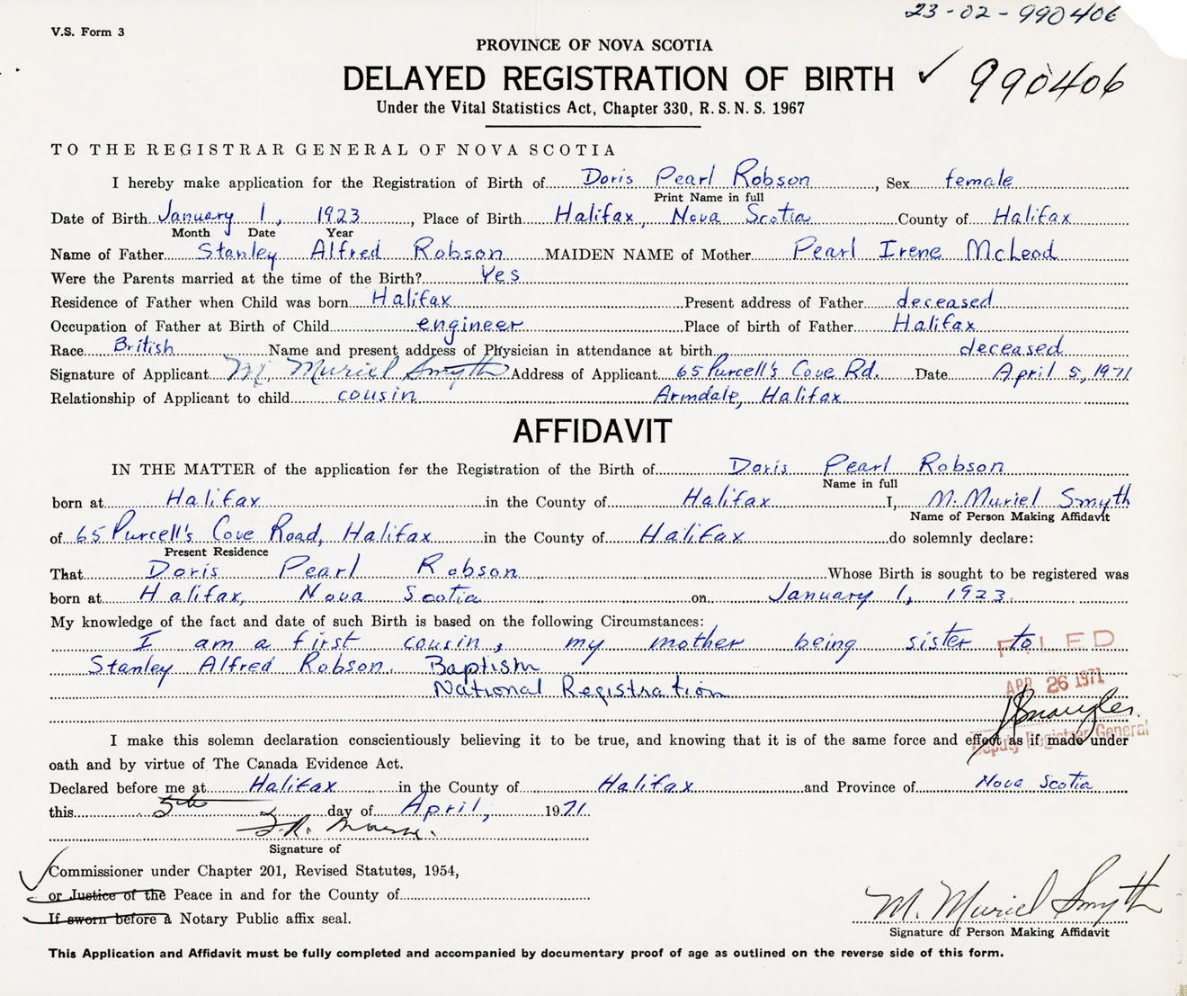 Signature of Applicant M. Muriel Smyth Address of Applicant 65 Purcells Cove Road, Armdale, Halifax, NS Date 5 April 1971