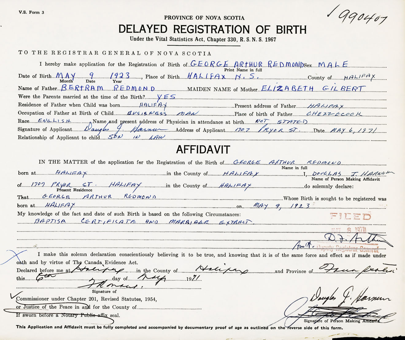 I hereby make application for the Registration of Birth of George ArthurRedmond Sex Male