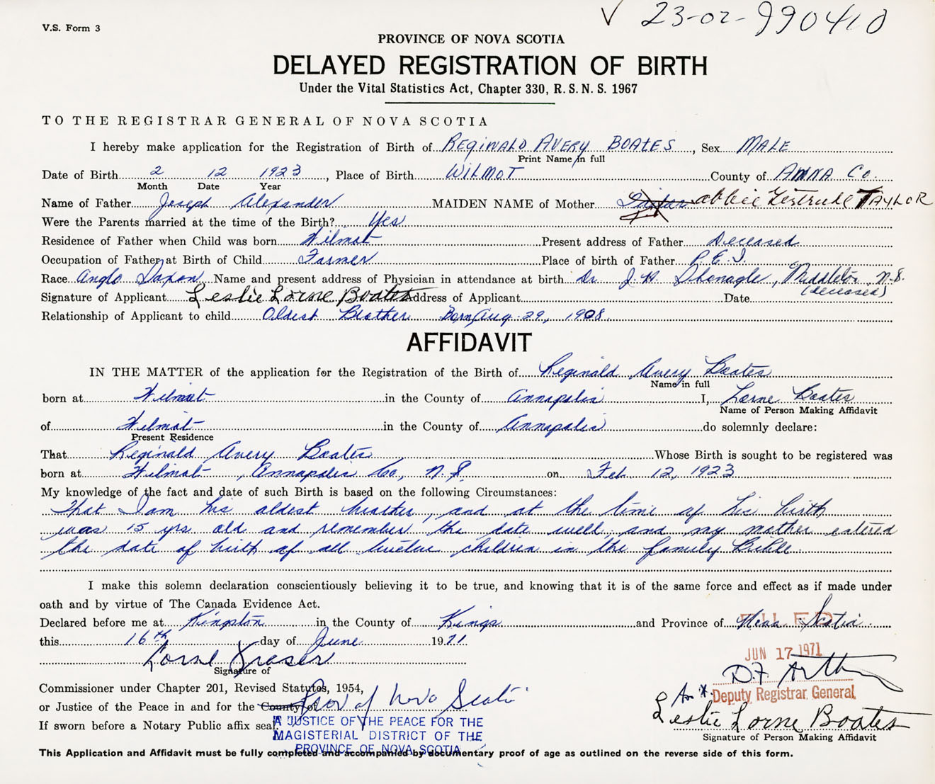 IN THE MATTER of the application for the Registration of the Birth of Reginald AveryBoates