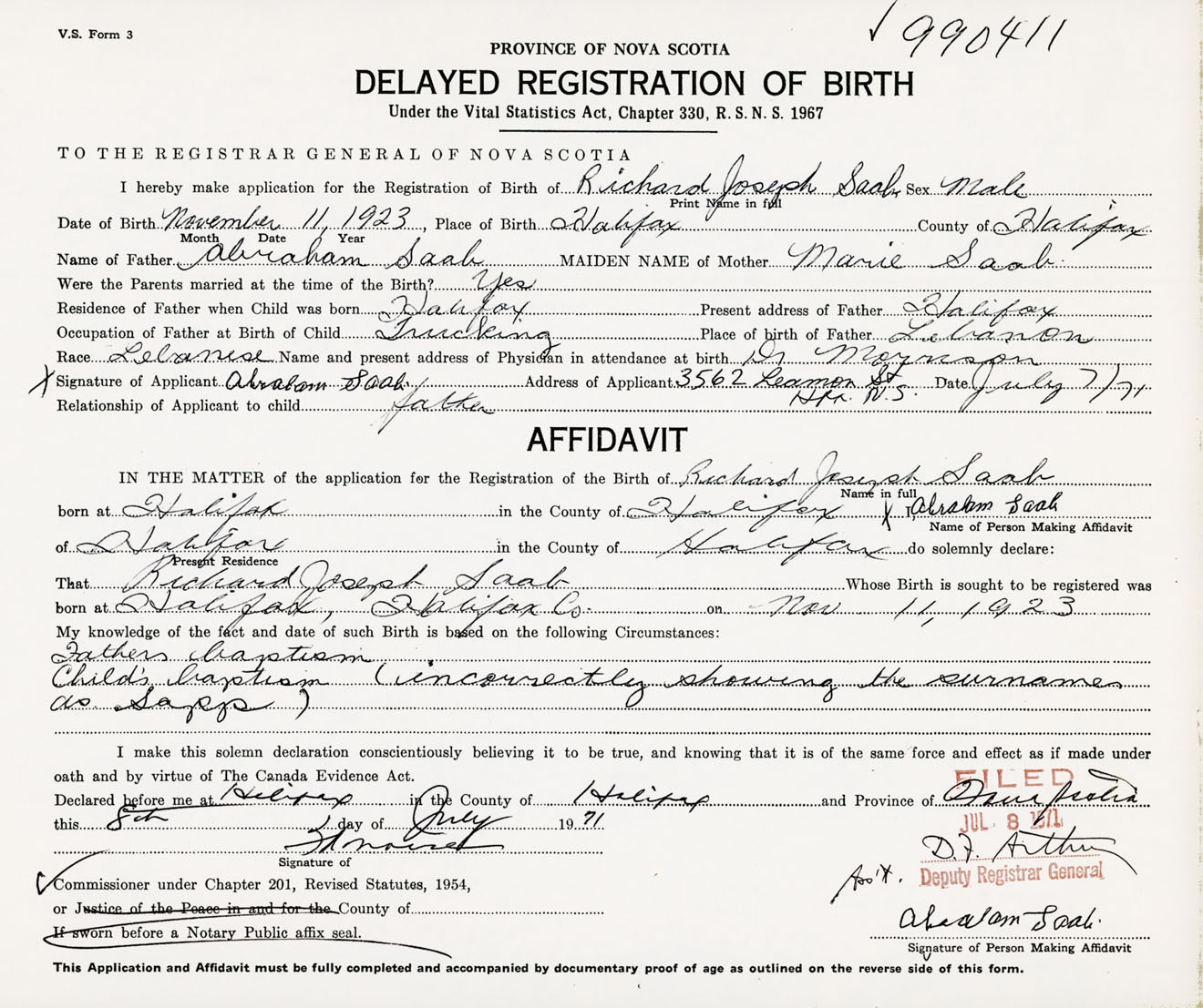 I hereby make application for the Registration of Birth of Richard JosephSaab Sex Male