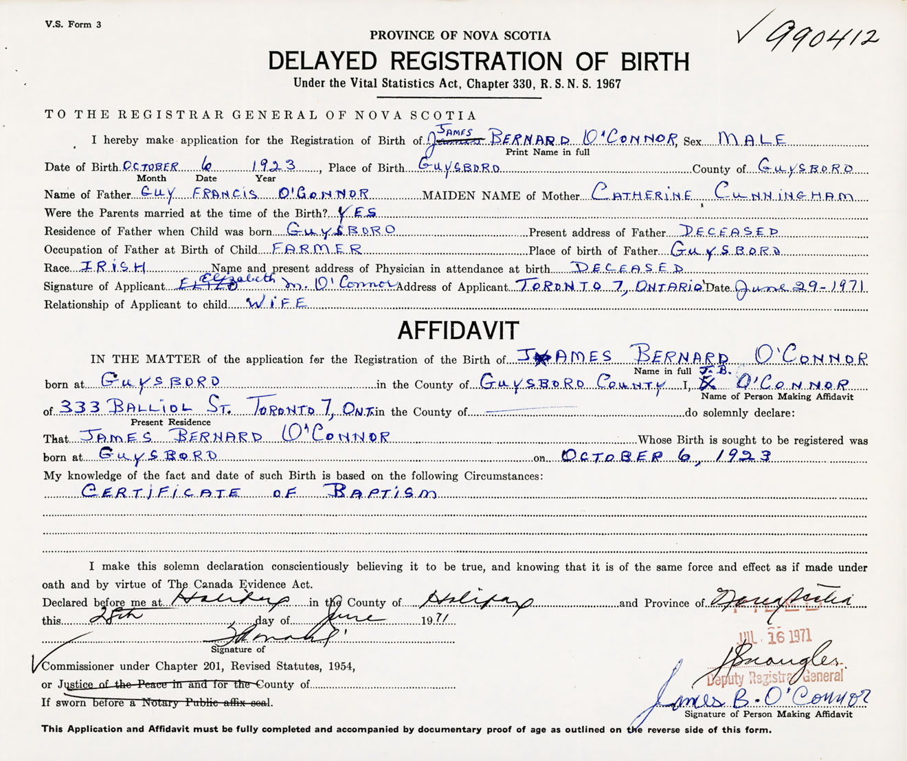 I hereby make application for the Registration of Birth of James BernardO'Connor Sex Male