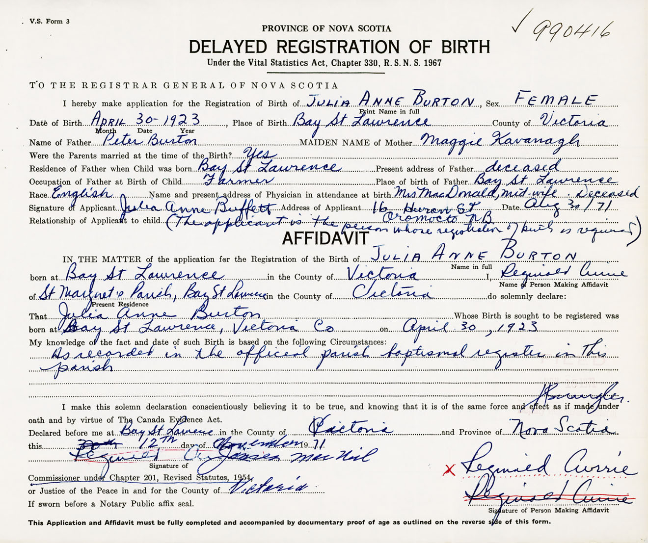 Residence of Father when child was born Bay St. Lawrence Victoria Co. Ns Present address of Father Deceased
