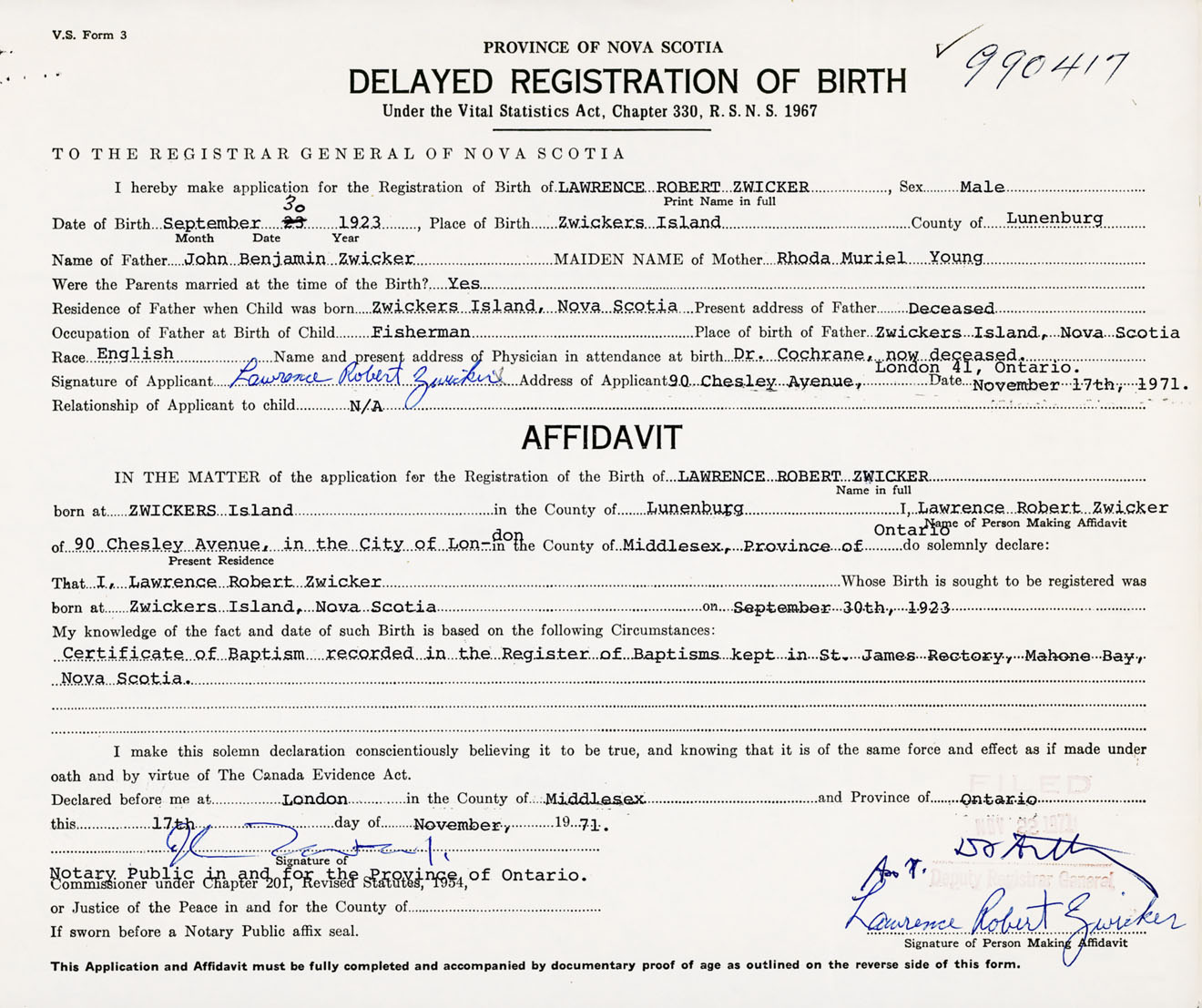 Signature of Applicant Lawrence Robert Zwicker Address of Applicant 90 Chesley Avenue, London, Ontario Date 17 November 1971