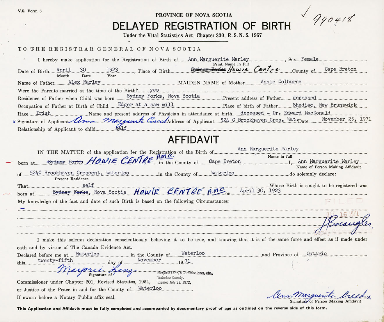 Signature of Applicant Ann Marguerite Creed Address of Applicant 524 C Brookhaven Crescent, Waterloo, Ontario Date 25 November 1971