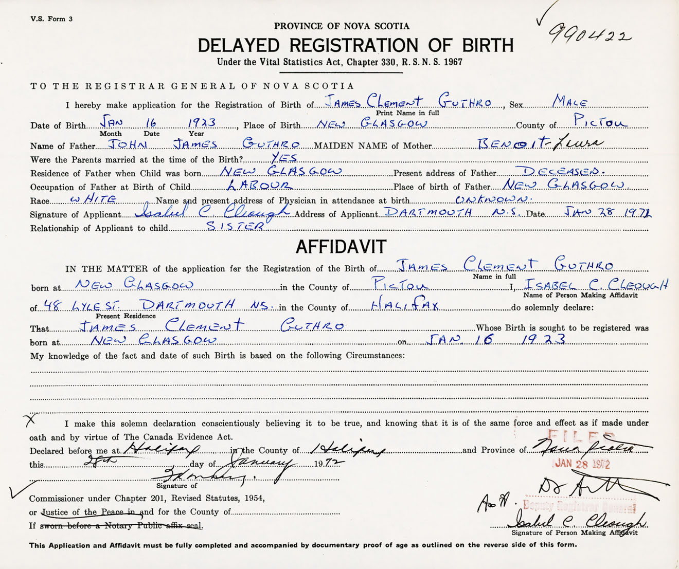 I hereby make application for the Registration of Birth of James ClementGuthro Sex Male