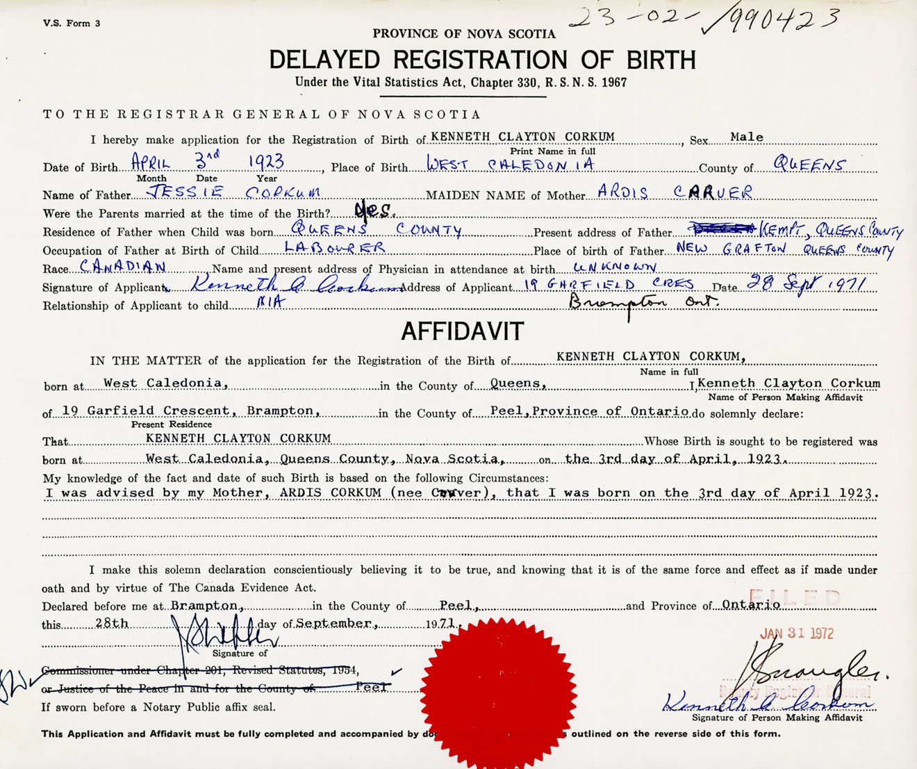 I hereby make application for the Registration of Birth of Kenneth ClaytonCorkum Sex Male