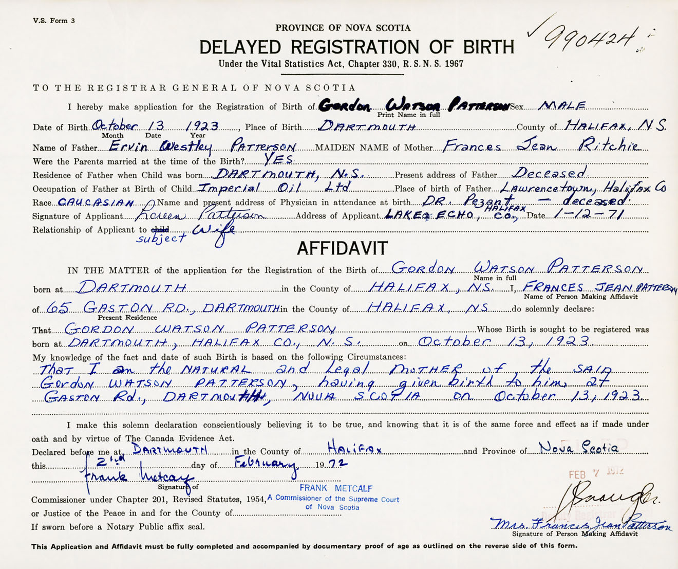 That I am the natural and legal mother of the said Gordon Watson Patterson, having given birth to him at Gaston Road, Dartmouth, NS on October 13, 1923.