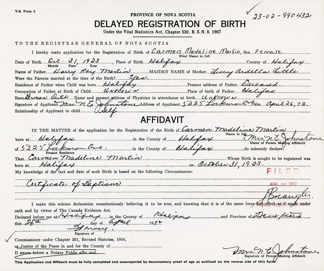 Signature of Applicant Mrs. N. E. Johnstone Address of Applicant 5225 Lockman Avenue, Halifax, NS Date 26 April 1972