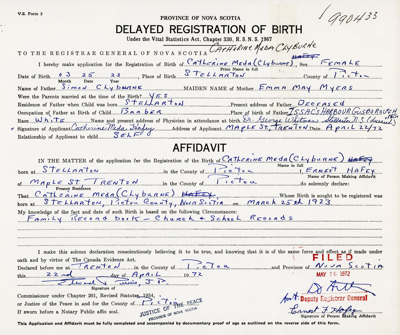 Signature of Applicant Catherine Meda Hafey Address of Applicant Maple Street, Trenton, Pictou Co., NS Date 22 April 1972