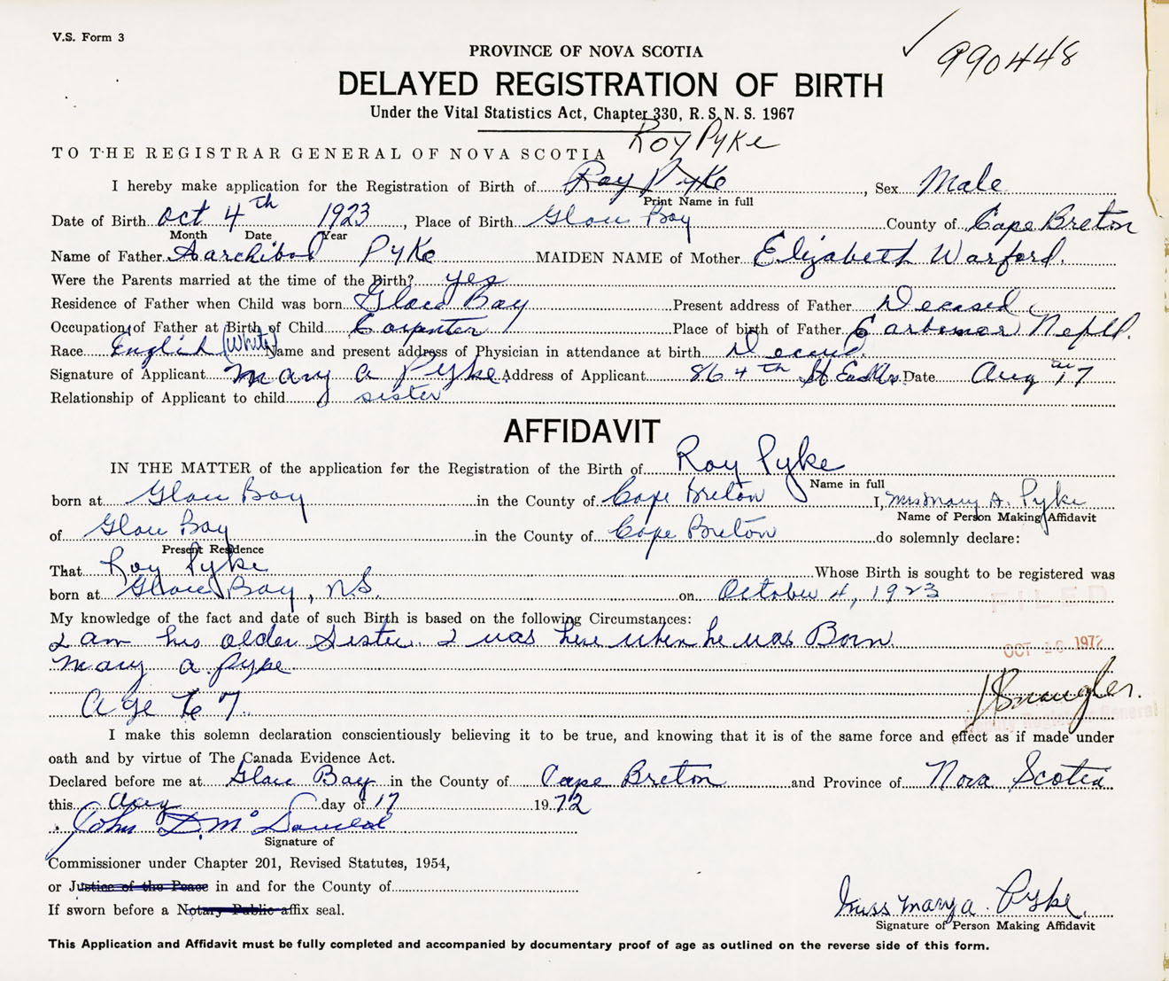 I hereby make application for the Registration of Birth of RoyPyke Sex Male