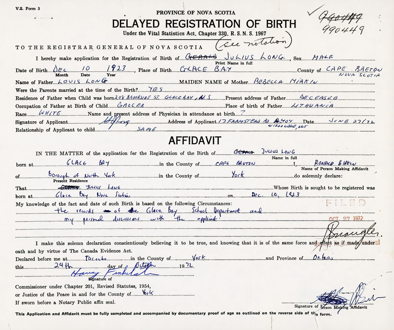 Signature of Applicant J. Long Address of Applicant 17 Farmstead Road, Apt 404, Willowdale, Ontario Date 27 June 1972