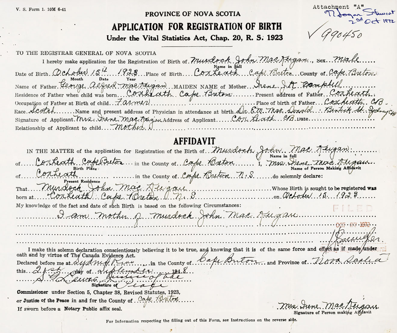 born at Coxheath Cape Breton County on October 15, 1923