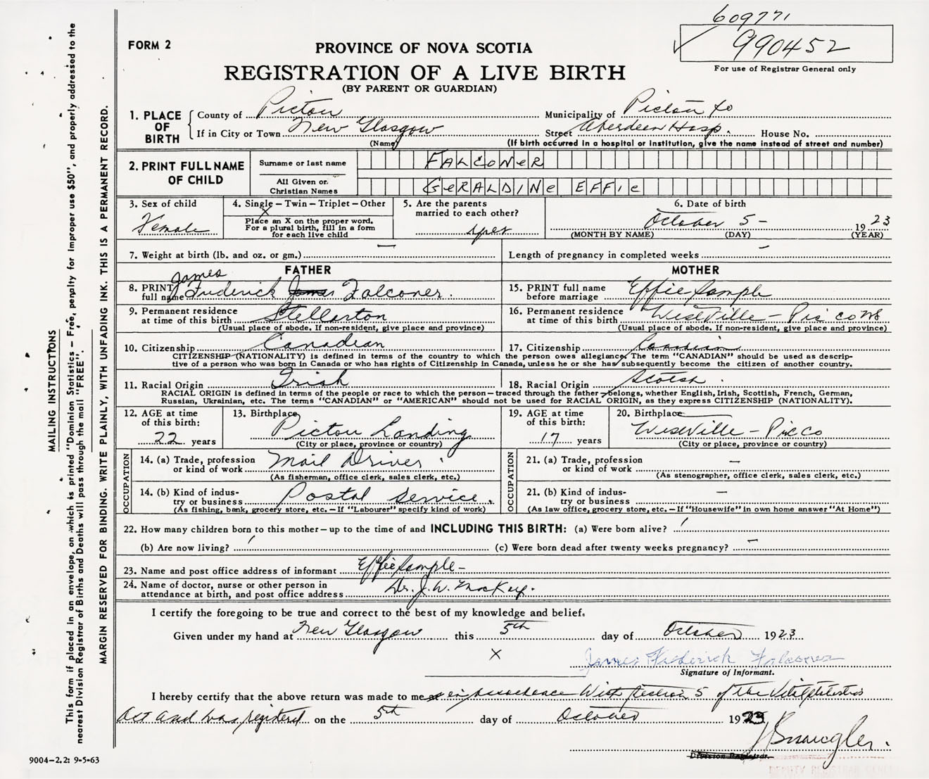 Female Birth Registration: Year: 1923 number: 99000452