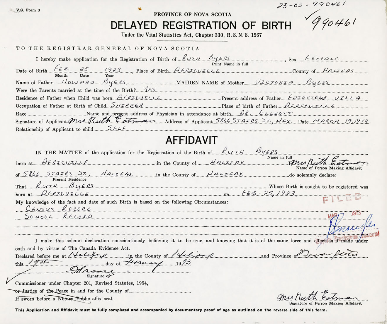 Signature of Applicant Mrs. Ruth Eatman Address of Applicant 5866 Stairs Street, Halifax, NS Date 19 March 1973