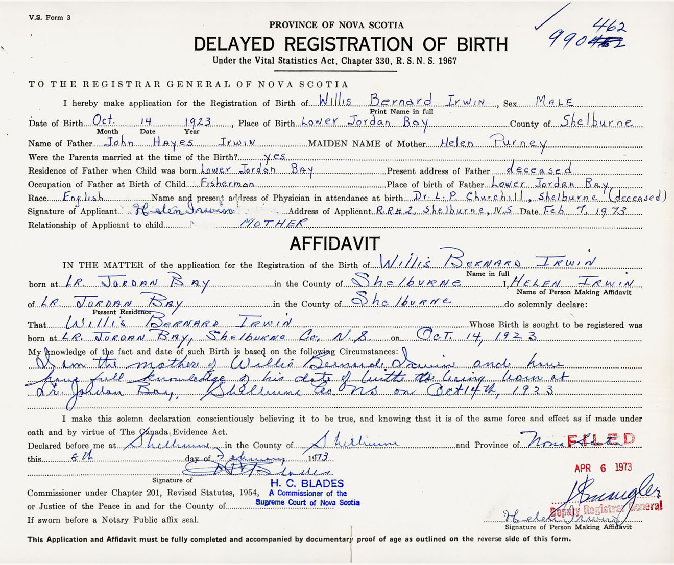 Signature of Applicant Helen Irwin Address of Applicant RR #2, Shelburne, NS Date 7 February 1973
