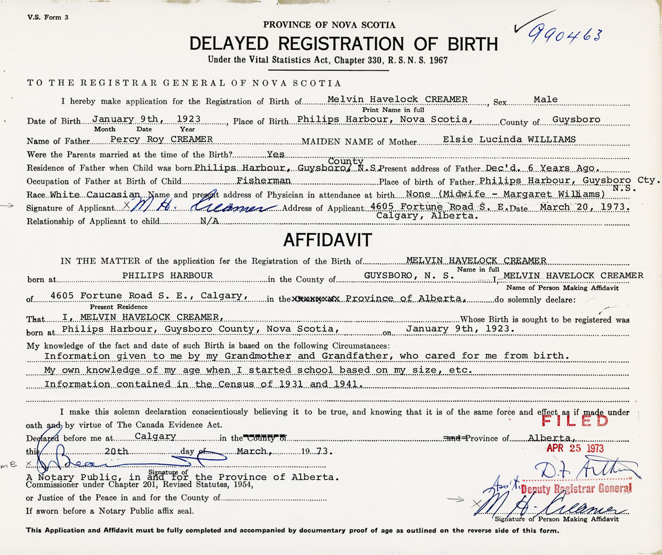 I hereby make application for the Registration of Birth of Melvin HavelockCreamer Sex Male
