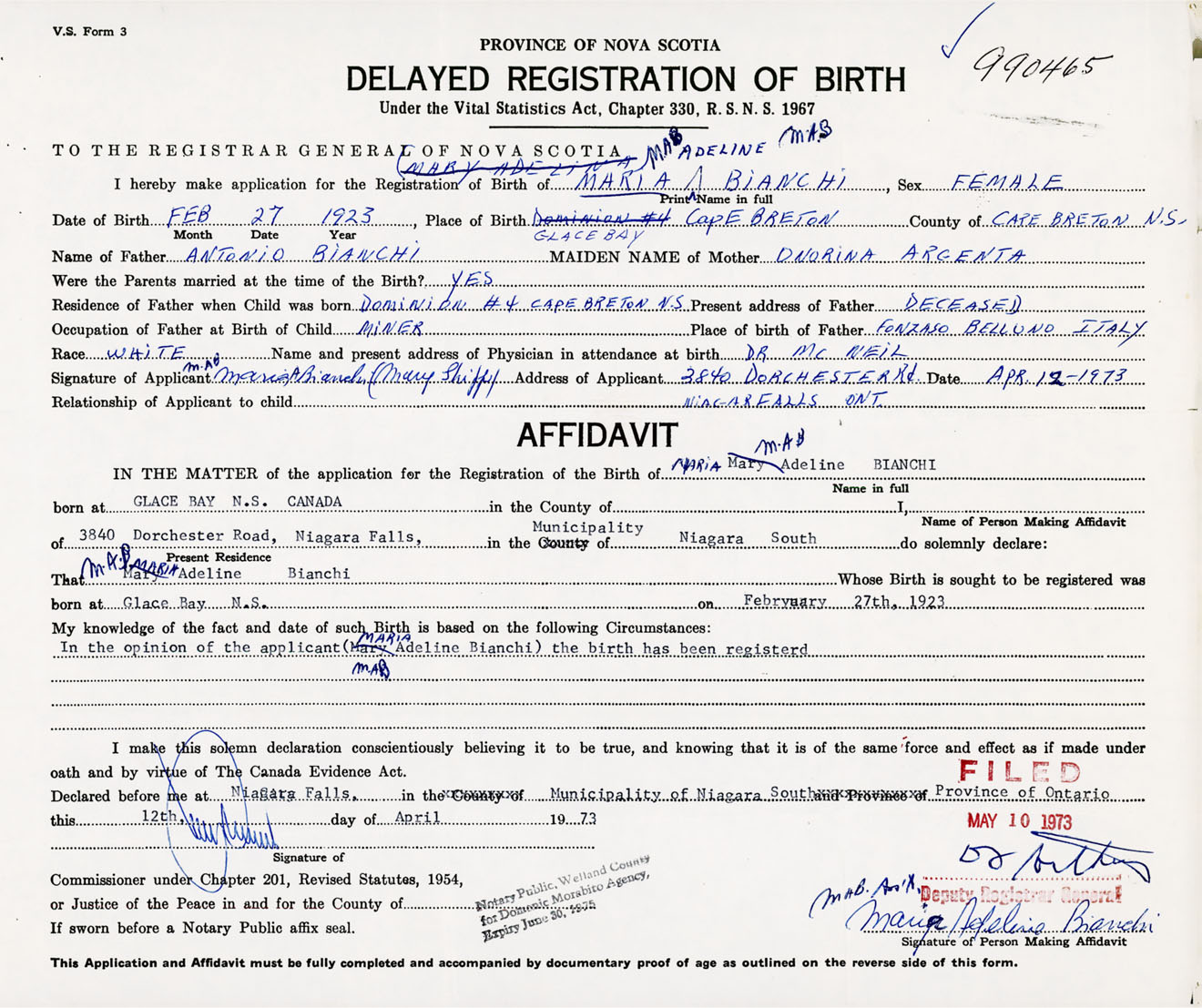 Signature of Applicant Maria A. Bianchi Mary Shipp Address of Applicant 3840 Dorchester Road, Niagara Falls, Ontario Date 12 April 1973