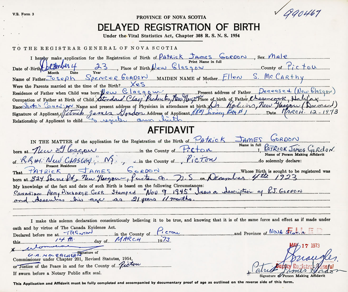 Signature of Applicant Patrick James Gordon Address of Applicant RR #1, Box 1, Linacy, Pictou Co., NS Date 12 March 1973