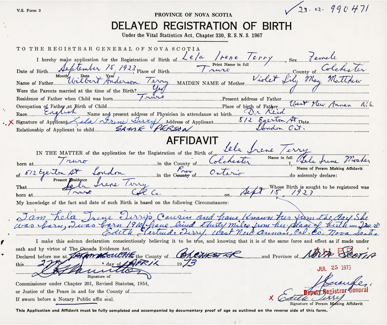 Signature of Applicant Lela Irene Terry Address of Applicant 512 Egerton Street, London, Ontario Date April 1973