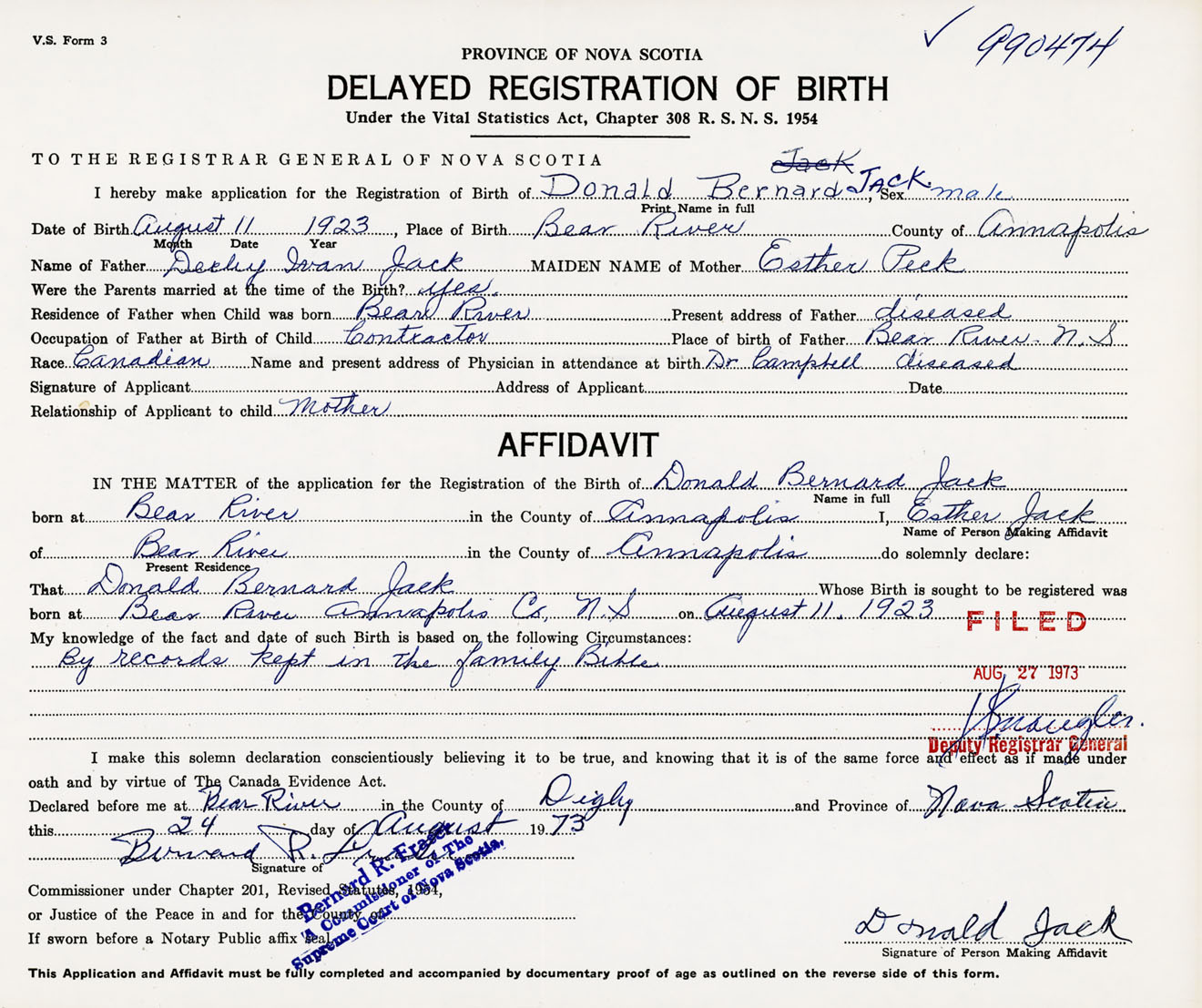 Date of Birth August 11, 1923 Place of Birth Bear RiverCounty of Annapolis
