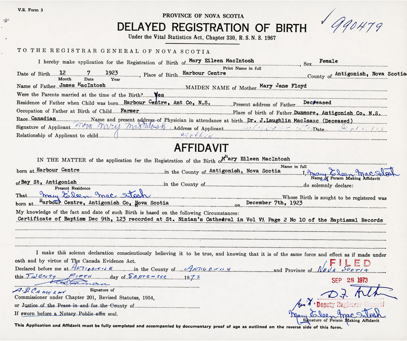 Signature of Applicant Mrs. Mary MacIntosh Address of Applicant Antigonish, NS Date 25 September 1973