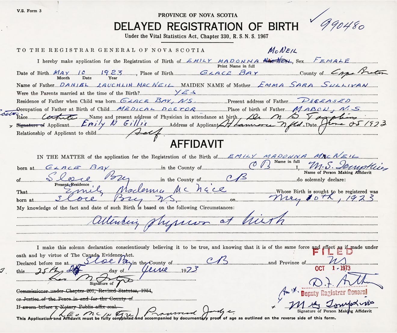 IN THE MATTER of the application for the Registration of the Birth of Emily MadonnaMcNeil